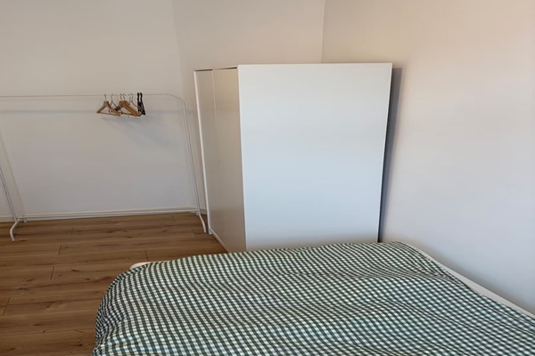 De bevindt zich op de eerste verdieping. De keuken is voorzien van inbouwapparatuur. Er is een gedeelde badkamer en een apart gedeeld toilet. De kamer kijkt uit op de straat. Het is uitgerust met een bed, nieuw beddengoed, een bureau en een bank. Ook is er een balkon dat gedeeld wordt met één huisgenoot. De gemeenschappelijke entree bevindt zich op de begane grond, met trap naar de eerste verdieping. De woning is voorzien van centrale verwarming en dubbele beglazing.