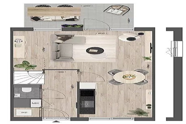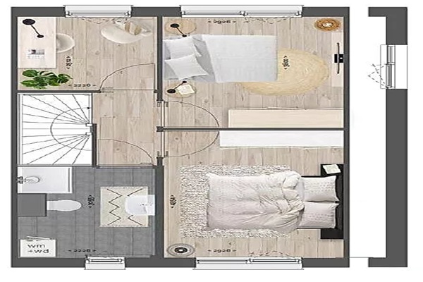 Deze hoekwoning heef een woonkamer met open keuken. De keuken is voorzien van een vaatwasser, inductiekookplaat met afzuigkap en een koelkast. De woonkamer heeft openslaande deuren naar het terras. Op de benedenverdieping bevindt zich tevens het toilet, warmtepomp en de meterkast. Op de eerste verdieping ligt de badkamer en 3 slaapkamers. De badkamer is voorzien van een inloopdouche, wastafel, tweede toilet en de aansluiting voor de wasapparatuur. De slaapkamers zijn 13, 11 en 6 m2.
