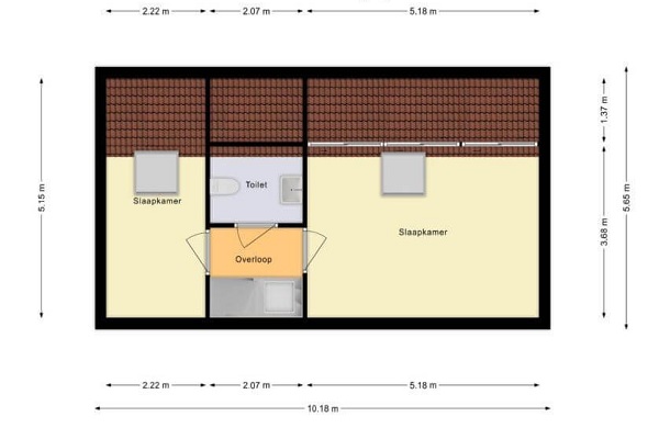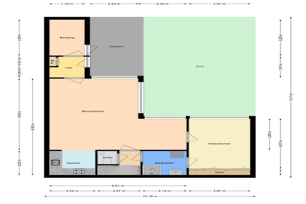 Indeling en nadere omschrijving: De entree van de woning bevindt zich aan de voorzijde welke u kunt bereiken via de carport. De carport kan zowel worden gebruikt als parkeerruimte voor uw auto als overkapping. Tegenover de entree bevindt zich tevens de deur aan de ruime zonnige tuin met terras. In de hal/entree treft u de meterkast en de toegang naar de separate inpandige berging met wasmachine aansluiting en de toegang tot de woonkamer. De berging is eveneens middels een eigen deur vanuit de carport bereikbaar. De woonkamer is ruim van opzet, heeft veel lichtinval en is op meerdere manieren in te richten. De kamer is voorzien van een moderne laminaatvloer en biedt tevens middels schuifpui toegang tot de tuin. De open keuken ligt aan de achterzijde van de woning en is ingericht in een hoek opstelling. De keuken beschikt over een koel-vriescombinatie, oven, keramische kookplaat en mechanische afzuiging. Via de woon/eetkamer is er toegang tot de slaapkamer. De slaapkamer, v.v. een grote garderobekast, is van een goed formaat en ca. 15 m2 groot. De en-suite badkamer is volledig betegeld. Er is een royale douchecabine, een ligbad en een wastafelmeubel. De woonkamer biedt tevens toegang tot een portaal met de trapopgang naar de 1e verdieping. In dit portaal bevindt zich tevens de separate toiletruimte. De toiletruimte is deels betegeld en voorzien van een staand closet en fonteintje. Via de trapopgang bereiken we de overloop met toegang tot de 2 aanwezige slaapkamers en badkamer. De 1e slaapkamer is ca. 7,6 m2 groot. De 2e slaapkamer is ca. 17,7 m2 groot en heeft een eigen wastafel. Beide slaapkamers zijn voorzien van een nieuwe moderne laminaatvloer. De kamers beschikken daarnaast beide over een groot Velux dakvenster. De 2e badkamer ligt tussen de 2 slaapkamers in en is voorzien van een tweede douchecabine en een tweede toilet.