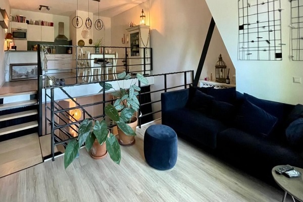 Centrale hal met een kleine trap naar de voordeur van het appartement. Ruime kamer met veel ruimte om een slaapkamer in te richten. Dit is geen afgesloten slaapkamer maar kan je gemakkelijk afschermen met bijvoorbeeld gordijnen. Toegang tot de badkamer welke is voorzien van een dubbele wastafel, zwevend toilet, inloop douche en design radiator. Naast de badkamer is nog een wasruimte aanwezig waar je een wasmachine en droger kunt plaatsen. In de ruimte is een open trap naar de eerste etage. Deze is verdeeld in een woon- en eetkamer op verschillende hoogtes. Het plafond is zeer hoog. Het woonkamer deel heeft enorme ramen waardoor er veel licht binnen valt. Vanaf hier heb je toegang tot het ruime terras. Via een paar treden stap je de eetkamer en keuken in. De keuken is modern en voorzien van verschillende inbouw apparatuur. Denk aan een inductie kookplaat, afzuigkap, vaatwasser en koelkast.