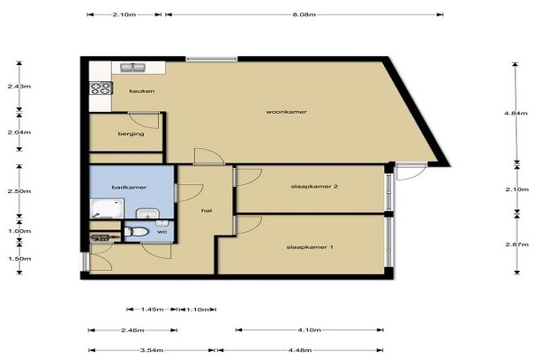 Middels verdeelhal toegang tot betegelde toiletruimte voorzien van toilet en fontein. Het appartement beschikt over twee slaapkamers en een geheel betegelde badkamer met inloopdouche en wastafel. Ruime woonkamer met uitstekende lichtinval en toegang tot balkon. In woonkamer gelegen keuken voorzien van de navolgende apparatuur: gaskookplaat, afzuigkap en koel- vriescombinatie. Naast keuken gelegen bijkeuken alwaar verwarmingsketel, mechanische afzuiging en aansluitpunt voor witgoed.