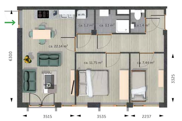 Indeling: entree, gang met toegang naar twee slaapkamers, de badkamer, separate toilet, berging voor o.a. wasmachine en de ruime woonkamer met keuken. De woonkamer heeft twee openslaande deuren met frans balkon, waardoor u kunt genieten van zonnestralen en de buitenlucht in uw woonkamer. De keuken is voorzien van elektrische kookplaat, afzuigkap, koelkast met vriesvak en combimagnetron. De badkamer is voorzien van inloopdouche.