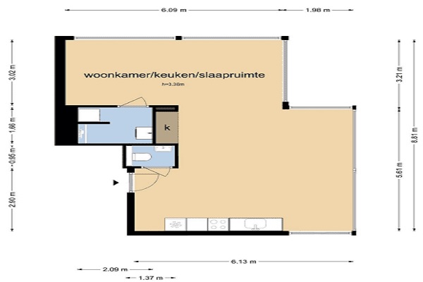 Indeling en kenmerken Deze loft is gelegen op de tweede etage. Bij binnenkomst tref je de open keuken. De keuken is voorzien van inbouwapparatuur. Vanuit het woon-/slaapgedeelte kom je bij het separaat toilet, bergkast en badkamer welke beschikt over een wastafel, inloopdouche en wasmachine aansluiting. –Voorzien van nette PVC-vloer –Gezamenlijk dakterras –Eigen parkeerplaats gelegen achter een slagboom –De woning wordt verwarmd middels stadsverwarming
