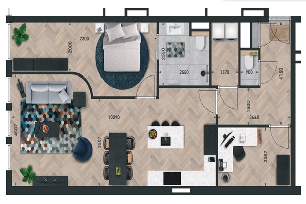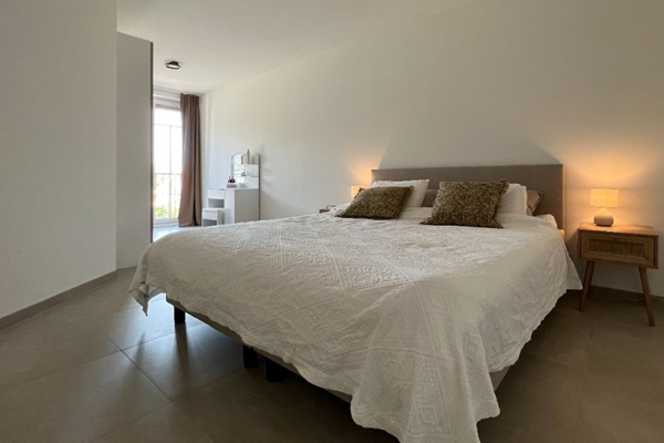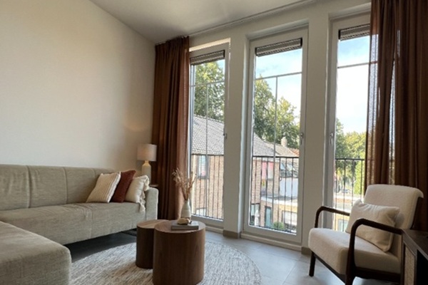 Dit appartement van 88 vierkante meter bevindt zich op de 1e verdieping en is gesitueerd aan de achterzijde van het gebouw. Naast een inpandige bergruimte en een ruime slaapkamer beschikt het appartement over een ruime woonkamer met open leefkeuken en brede raampartijen met Franse balkons die zorgen voor de toetreding van veel natuurlijk licht. De slaapkamer heeft een badkamer ensuite en er is tevens nog een tweede. Bewoners van dit appartement hebben tevens de beschikking over toegang tot het gemeenschappelijk terras op het plat dak van de eerste verdieping en een eigen berging in de kelder van het gebouw. Deze is langs de achterzijde van het gebouw te bereiken. Door de aanwezigheid van een loopgoot kunnen fietsen gemakkelijk meegenomen worden naar beneden. Fietsen kunnen hier tevens opgeladen worden.