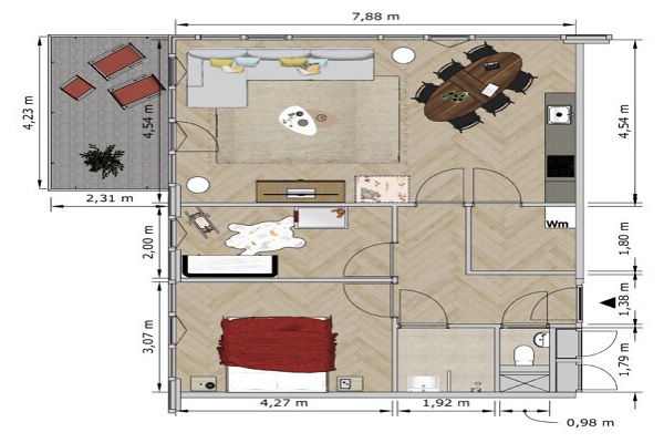 Het appartement bevindt zich op de 5e verdieping van het complex. Met 77m2 is dit appartement ruim te noemen. Met grote ramen van vloer tot bijna aan het plafond is het ook licht te noemen. De woonkamer met open keuken (voorzien van inbouwapparatuur) geeft je een mooi uitzicht door de grote ramen. Extra genieten doe je op het balkon. Er zijn twee slaapkamers, één grote en een kleinere, in te richten als logeerkamer of werkkamer. De badkamer is volledig betegeld en heeft een inloopdouche met wastafel. Het toilet is apart gelegen in de gang. In de interne berging kun je een wasmachine plaatsen.