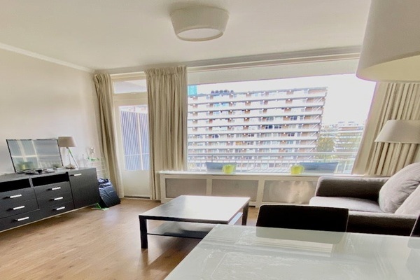 INDELING: –Centrale hal met bellenplateau –Toegang naar liften; –Berging –Entree met hal; –Ruime lichte woonkamer met balkon; –Open keuken met alle inbouwapparatuur; –Badkamer met toilet en douche (met wasmachine en droger); –Slaapkamer met kasten . Delers, studenten niet toegestaan.