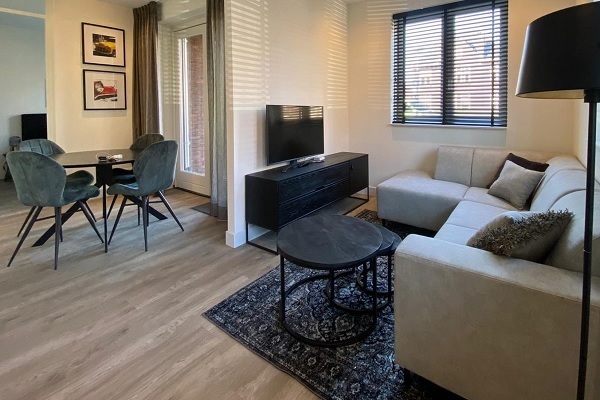 Indeling Centrale entree met brievenbussen en digitale intercom. Hal welke toegang verleent naar de toiletruimte, woonkamer en technische installatie ruimte. De toilet is gedeeltelijk betegeld en voorzien van fontein en hangend toilet. De gemeubileerde woonkamer heeft een zitgedeelte en eethoek. De zithoek is ingericht met televisiemeubel, hoekbank, vloerkleed. De eethoek bestaande uit een tafel met 4 stoelen bevind zich dicht bij de open keuken. Ter hoogte van de eethoek zijn 2 openslaande deuren die toegang geven tot het balkon. De moderne keuken is voorzien van spoelbak met mengkraan, inductie kookplaat, afzuiging, combi-oven/magnetron, vaatwasser en koelkast met vriesvak. De moderne badkamer is voorzien van een ruimte douche, wastafelmeubel met opbergruimte, wasmachine en droger. Door de grote vloertegels en donkere wandtegels heeft de badkamer een luxe uitstraling. De ruime slaapkamer heeft een garderobekast en een gestoffeerd tweepersoons bed. Beide slaapkamers zijn volledig gestoffeerd inclusief raamdecoratie/gordijnen. De technische ruimte bestaat uit installaties voor o.a. vloerverwarming en ventilatie. Niet geschikt voor studenten of groepsbewoning