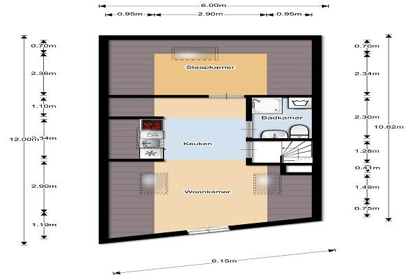 Indeling Begane grond: Entree met hal en trapopgang naar de 2e verdieping. 2e verdieping: Binnenkomst in keukengedeelte met ingebouwde koelkast met vriesvak, combi oven/magnetron, keramische kookplaat en vaatwasser. Aan de voorzijde is de woonkamer met openslaande deuren (Frans balkon), en aan de achterzijde bevindt zich de slaapkamer. Vanuit het keukengedeelte heeft u toegang tot de ruime badkamer met douche, wastafel, toilet en wasmachine aansluiting.