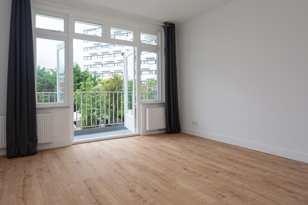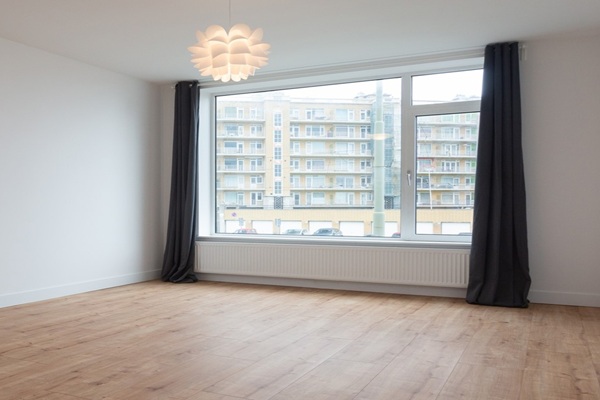 Indeling: Centraal gesloten portiek; trappenhuis naar de eerste verdieping. Eerste verdieping: Entree appartement; L-vormige hal met garderobe met zeer lichte en royale woon/-eetkamer met leuk zeezicht; separaat toilet met fonteintje; nieuwe badkamer met inloopdouche, ligbad, dubbele wastafel, spiegelkast en designradiator; ruime eetkeuken met bar, nieuwe inbouwapparatuur inclusief inductie koken met 'Bora afzuiging' en Miele, extra grote ijskast, genoeg werk- en opbergruimte; eerste ruime slaapkamer met deur naar achterbalkon (ZO), met balkonkast; wasmachine; tweede zeer ruime slaapkamer aan de achterzijde met openslaande deuren naar 2e achterbalkon (ZO); derde slaapkamer aan voorkant. De gehele woning is voorzien van een hoogwaardige nieuw laminaat vloer met extra vloerisolatie.