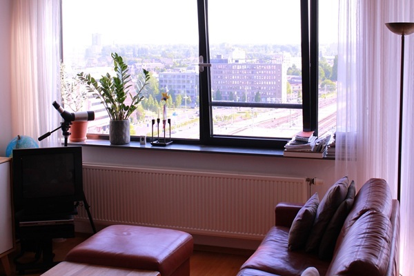 NIET VOOR STUDENTEN Indeling Gezamenlijke entree met lift naar de 9e etage (13e verdieping), entree appartement, hal met videofoon, een stookruimte met wasmachine en droger, apart toilet met fonteintje. Ruime, lichte woonkamer van 36 m2, met massief eiken parket vloer. Open keuken van 6 m2 voorzien van magnetron, afzuigkap, ijskast, vaatwasser. Badkamer met bad, aparte douche, wastafel. Slaapkamer van 14,5 m2, voorzien van 2-persoonsbed en kledingkast. Slaapkamer 11,5 m2 voorzien van 1-persoonsbed en kledingkast. Het appartement is zeer centraal gelegen, naast centraal station en dichtbij centrum.