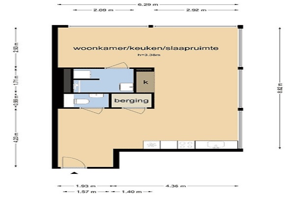 Indeling en kenmerken Deze loft is gelegen op de vijfde etage. Bij binnenkomst tref je de berging en het separate toilet. De open keuken is voorzien van inbouwapparatuur. Vanuit het woon-/slaapgedeelte kom je bij de badkamer welke beschikt over een wastafel, inloopdouche en wasmachine aansluiting. –Voorzien van nette PVC-vloer –Gezamenlijk dakterras –Eigen parkeerplaats gelegen achter een slagboom –De woning wordt verwarmd middels stadsverwarming