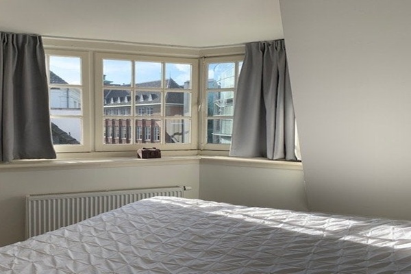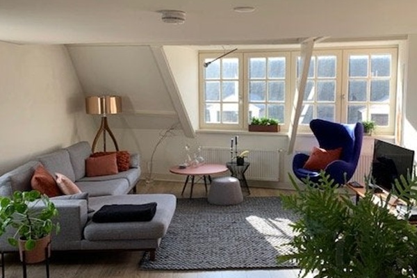 Indeling: Centrale entree/hal met trappartij, bellenplateau en brievenbussen. Entree met trap naar de tweede verdieping en doorloop naar de zeer ruime en lichte woonkamer. In de woonkamer is meer dan voldoende ruimte voor een zithoek, eettafel en eventuele werkplek. De sfeervolle woonkamer is voorzien van stucwerk wanden en een dito plafond en heeft een sfeervolle authentieke balkenconstructie. Daarnaast is het gehele appartement voorzien van een mooi afgewerkte laminaatvloer in lichte kleurstelling. De keuken is uitgevoerd met diverse inbouwapparatuur zoals een 4-pits gasfornuis, wasemkap, combi-magnetron en koelkast. De grootste slaapkamer is gelegen aan de voorzijde van de woning met grote raampartij en sfeervol balkenplafond. De geheel betegelde badkamer is uitgerust met een douche, wastafel en tweede toilet. Naast de woonkamer is nog een tweede ruime slaap-/ werkkamer gesitueerd.