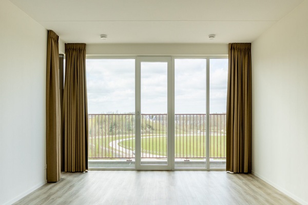 Indeling: Met uitzondering van de natte ruimtes is het gehele tussenappartement voorzien van een mooie, warme PVC vloer met vloerverwarming. Grote ramen van vloer tot plafond zorgen voor veel natuurlijk licht en een ruimtelijk gevoel. De ramen zijn voorzien van luxe zonwering of verduisteringsgordijnen. De woonkamer met open keuken is ruim. De moderne keuken, met witte kasten en zwart stalen handgrepen, is voorzien van RVS Bosch inbouwapparatuur, waaronder een koel-vriescombinatie, inductiekookplaat, vaatwasser en combimagnetron. Vanuit het woongedeelte leidt een deur naar het grote balkon met prachtig vrij uitzicht. De badkamer is voorzien van een grote tegelvloer, een wastafel, een ruime inloopdouche en een designradiator. Het aparte toilet is voorzien van dezelfde grote tegels en een klein fonteintje. Er zijn twee ruime slaapkamers, elk met aangenaam natuurlijk licht. Naast deze slaapkamer beschikt het appartement ook over een ruime berging voor het opbergen van overige spullen.