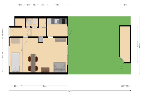 Gemeubileerd appartement beschikbaar voor een stel of één persoon. Het appartement is gelegen op de begane grond en beschikt over een eigen tuin. Het appartement is recentelijk gerenoveerd (2021) En er is in 2025 een nieuwe schuur geplaatst met zonnepanelen. Het appartement is modern en wordt volledig gemeubileerd opgeleverd. De woonkamer is voorzien van een bank, tafel met stoelen, kasten en televisie. De slaapkamer heeft een tweepersoonsbed met voldoende opbergruimte voor kleding. De badkamer is voorzien van een regendouche en kast met spiegel en er is een aparte ruimte waar de wasmachine en droger staan. Er is een apart toilet. De keuken is voorzien van een vaatwasser, koelkast en vriezer, oven en inductiekookplaat. Via grote glazen schuifpui is de tuin bereikbaar. De tuin is voorzien van een terras en een grote nieuwe schuur (6 m x 3,7 m). Het appartement heeft energielabel A+,