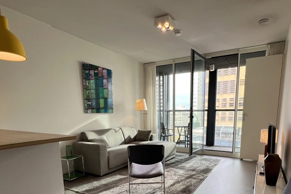 Indeling: Afgesloten gezamenlijke entree met receptie, lift en intercom. Entree. Via de hal krijgt u toegang tot de woonkamer en het toilet, De woonkamer is voorzien van mooie, moderne meubels. De moderne open keuken met bargedeelte is van alle gemakken voorzien; koelkast, vaatwasser, combi magnetron, inductie kookplaat en afzuigkap. Via de woonkamer heeft u toegang tot het balkon en de slaapkamer en aangrenzende badkamer. Bergruimte met was/droger combinatie. De receptie levert diensten zoals het aannemen van pakketjes, laten stomen van kleren en het regelen van een strijkservice. Het complex beschikt over een gezamenlijke fietsenberging waarbij de verhuurder een fiets voor de huurder ter beschikbaar zal stellen.