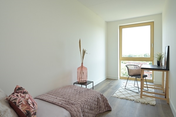 Indeling van het appartement Bij binnenkomst via de entree “Bordewijk” word je verwelkomd in een ruime hal die toegang biedt tot: –een apart toilet –een interne berging met aansluitingen voor wasmachine en droger –een luxe badkamer met moderne afwerking –twee comfortabele slaapkamers –een royale en lichte woonkamer met open keuken –ruim en zonnig terras (zuid) De woonkamer biedt toegang tot een balkon, waar je heerlijk buiten kunt zitten en genieten van de (middag)zon.