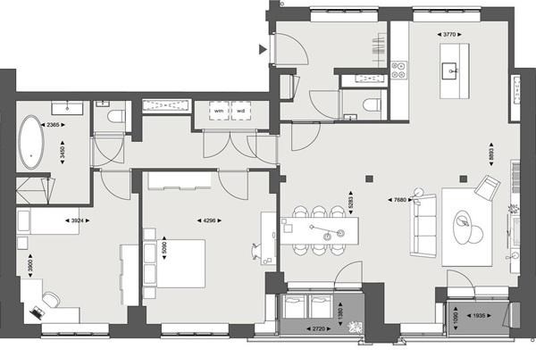 De moderne, strak vormgegeven keuken is voorzien van hoogwaardige inbouwapparatuur en stenen werkbladen. In de bijzondere fraai afgewerkte badkamers bieden het vrijstaande ovale bad (een aantal woningen beschikt niet over een ligbad), en het royale badmeubel u het luxueuze gevoel. De grotere appartementen beschikken bovendien over een badkamer en-suite in de masterbedroom. Het ontwerp met de grote glazen puien van vloer tot plafond schept een gevoel van ruimte en geeft prachtig uitzicht.