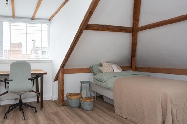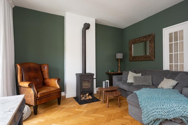 Indeling: Gemeenschappelijke oprit; entree; entree appartement; halletje met meterkast; trap naar 1e verdieping; hal; toilet, openslaande deuren naar woonkamer ca. 6.55 x 4.35/2.80 met open haard, erker en openslaande deuren naar voorbalkon ca. 3.15 x 0.90, bijgetrokken eetkamer ca. 3.15 x 3.10; dichte keuken ca. 3.95 x 2.00 en tevens met toegang tot het achterbalkon op de middag- en avondzon ca. 6.25x 0.95 met balkonkast; slaapkamer ca. 4.00 x 3.95 met kastenwanden en toegang tot het achterbalkon; badkamer met douche en badkamermeubel. 2e etage: overloop; 2e toilet met fonteintje; voorslaapkamer ca. 4.45/3.15 x 5.15 met dakkapel; achterslaapkamer ca. 4.65 x 3.60 met dakkapel, vliering met slaapmogelijkheid.