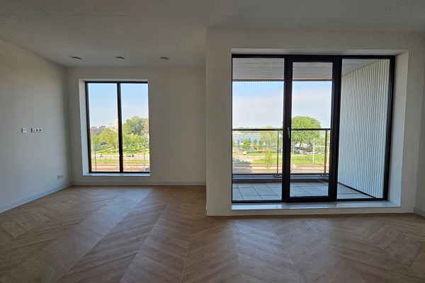 Het appartement ligt op de derde verdieping aan de rustige waterzijde van het complex, waardoor je vanaf het overdekte balkon geniet van een vrij uitzicht. Bij binnenkomst tref je een ruime hal met aan weerszijden twee grote slaapkamers. Verderop bevinden zich een separaat toilet, een moderne badkamer met inloopdouche en een praktische wasruimte met aansluiting voor wasmachine en droger. In deze ruimte is ook het Warmte-Terugwin-systeem (WTW) geplaatst, dat zorgt voor een constant en prettig binnenklimaat. De woonkamer is licht en royaal opgezet en biedt volop indelingsmogelijkheden. De open keuken is modern afgewerkt en uitgerust met alle inbouwapparatuur: een vaatwasser, combi-oven, inductiekookplaat, afzuigkap en koel-vriescombinatie.