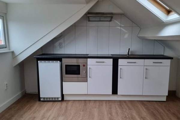 Indeling: Gezamenlijke entree met trapopgang naar de tweede etage. Op deze etage is de nieuwe badkamer gelegen. De badkamer is voorzien van een douche, wastafel en aansluiting voor de wasmachine. Trapopgang naar de derde etage waar de studio zich bevindt. Overloop met doorloop naar de ruime woon- slaapkamer met grote open keuken. De keuken is voorzien van een koelkast, magnetron, kookplaat en afzuigkap. Separaat toilet. Geschikt voor 1 person