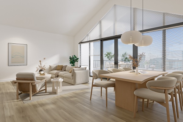 Indeling Via de centrale entree op de begane grond brengt de lift je naar het dakniveau, waar je uitkomt op het gezamelijke dakterras en de voordeur van de woning. Binnen leidt de hal naar twee slaapkamers, de badkamer, een separaat toilet, een inpandige berging en de lichte woonkamer met open keuken. Vanuit de woonkamer heb je direct toegang tot het dakterras. De afwerking is hoogwaardig. De appartementen zijn voorzien van een PVC-visgraatvloer met vloerverwarming in alle ruimtes. De keuken is compleet uitgerust met inbouwapparatuur: kookplaat, combioven, vaatwasser, afzuigkap en koel-vriescombinatie.De badkamer is stijlvol uitgevoerd met een ligbad, inloopdouche, dubbele wastafel en handdoekradiator. Extra opbergruimte is aanwezig in de berging én op de vliering, waar ook de installaties zijn geplaatst. Duurzaamheid staat centraal. De woningen zijn gasloos en uitgerust met een warmtepomp en zonnepanelen – klaar voor de toekomst. Parkeren en fietsen? Ook daar is aan gedacht. Er is parkeergelegenheid (middels een abonnement) en een gezamenlijke fietsenberging beschikbaar voor bewoners.
