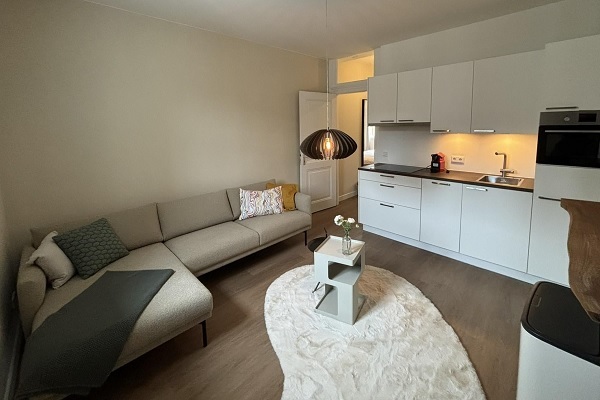 Indeling: Souterrain: Gezamenlijke wasruimte met wasmachine en droger. Begane grond: Entreehal met fietsenberging. Entree appartement met toegabng tot: Woonkamer met luxe open keuken voorzien van alle apparatuur, eethoek en lounge. De slaapkamer is aan de achterzijde gelegen. 3e verdieping: De badkamer is voorzien van een douche, toilet en wastafel. Alles is volledig ingericht volgens de nieuwste woontrends.