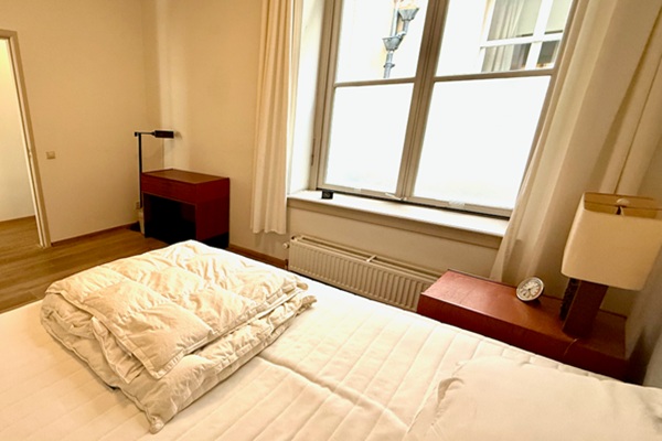 Indeling Het historische pand kijkt aan de straatzijde uit op een karakteristiek plein, via welke de elegante entree van het appartementencomplex te bereiken is. Achter de klassieke voordeuren bevindt zich een grote hal met bellentableau, intercom en brievenbussen. De deur van het appartement bevindt zich na binnenkomst van het complex aan de linkerkant. Via de voordeur is een grote hal die toegang geeft tot de woonkamer. De woonkamer strekt zich uit over de grootste breedte van het appartement en is voorzien van hoge ramen die uitkijken over de straatkant, waardoor de kamer licht en open is. Het eetgedeelte is voorzien van een verhoogde tafel met karakteristiek houten blad en naast de eettafel is de halfopen keuken gesitueerd. De L-vormige keuken is ruim van opzet en voorzien van luxe inbouwapparatuur en hoogwaardige afwerking. De keuken is voorzien van een vaatwasser, dubbele spoelbak, grote koel+vriescombinatie, 5-pits gasfornuis en een lang granieten aanrechtblad. De hoofdslaapkamer is ruim met een kingsize bed en grote kastruimte. De tweede slaapkamer is circa 10m2 en biedt voldoende ruimte voor een kast en een tweepersoonsbed. Het appartement is voorzien van moderne houten vloeren, die het hele appartement bedekken en het prachtige ontwerp van de plek afmaken. De badkamer bevindt zich aan het einde van de hal naast de masterbedroom en beschikt over een ruim ligbad en aparte douche.