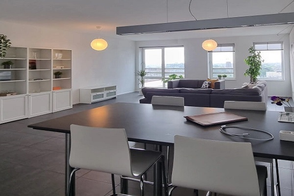 Indeling: De gezamenlijke entree beschikt over een bellentableau, brievenbussen en meerdere liften. Door de voordeur kom je in de hal met kapstok en toegang tot alle kamers van het appartement. De ruime woon/eetkamer geeft toegang tot de open keuken met combi magnetron/oven, koelvriescombinatie, vaatwasmachine, halogeen kookplaat met afzuigkap en opbergruimte. Direct naast de keuken is een ruime bijkeuken/berging met wasmachine, vriezer, werkblad en voorraadkasten. Het eetgedeelte bestaat uit een granietentafelblad met vier barkrukken. Het zitgedeelte in de woonkamer bestaat uit een ruime hoekbank, een 2-persoonsbank, tv-meubel en een open kast. Alle kamers zijn ruim en hebben grote ramen hetgeen dat, naast het prachtige uitzicht, resulteert in veel daglicht in het gehele appartement. De hoofdslaapkamer is voorzien van een ruime garderobekast met schuifdeuren en een tweepersoons boxspring. De 2e slaapkamer/studeerkamer beschikt over een ruim bureau, een slaapbank en een dressoir. De badkamer is ruim en beschikt over een dubbele wastafel met meubel, spiegel met verlichting, ligbad, aparte douche, handdoekradiator en hoge opbergkast. Het appartement is één van de drie appartementen op de veertiende verdieping. Het appartement heeft onbelemmerd uitzicht op de rivier de Maas en is geheel voorzien van vloerverwarming en -koeling die individueel per kamer ingesteld kan worden. De Wijnhaeve toren bestaat uit 63 appartementen, een stallingsgarage voor auto’s en afsluitbare bergingen onder het gebouw. Aan de noord-oostkant en de zuidwestkant van het gebouw bevinden zich twee tuinen die alleen voor bewoners toegankelijk zijn. De toren heeft twee liften en twee (nood)trappenhuizen.