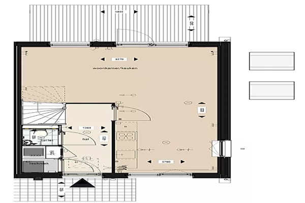 Via de hal kom je in een praktische indeling met aan de rechterzijde drie deuren en een trap naar boven. Achter de eerste deur bevindt zich de technische ruimte, gevolgd door de meterkast en een keurig afgewerkt, hangend toilet met fonteintje. De lichte woonkamer voelt ruim en uitnodigend aan. Via de schuifpui stap je zo op je eigen terras van circa 20 m² – een heerlijke plek om buiten te zitten met volop privacy en uitzicht op groen, zonder directe buren. Aan de voorzijde ligt de open keuken in lichte kleuren. Deze is modern uitgevoerd met strakke grepen en voorzien van alle inbouwapparatuur, waaronder een inductiekookplaat, combimagnetron, vaatwasser en afzuigkap. De grote ramen tot aan de vloer zorgen voor veel licht en contact met de levendige straat. Boven bevinden zich twee ruime slaapkamers. De grootste slaapkamer van circa 14,6 m² biedt genoeg ruimte voor een werk- of kleedgedeelte en heeft extra ramen die zorgen voor een prettige lichtinval. De tweede slaapkamer, van 10,8 m², is eveneens ruim en praktisch in te delen. De badkamer (6,7 m²) is netjes afgewerkt en voorzien van een wastafel met spiegel, glazen planchet, douche met glazen wand en een elektrische wandradiator. Ook hier vind je het tweede, hangende toilet. Er is plek voor een wasmachine en eventueel een droger.