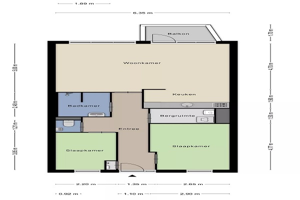 Bij binnenkomst sta je in de hal. Direct links en rechts bevinden zich de twee slaapkamers. Verder in de hal vind je een apart toilet met fonteintje en een inpandige berging van circa 4 m² met aansluiting voor de wasmachine. Vanuit de hal loop je rechtdoor de lichte en ruime woonkamer binnen. De woonkamer vormt het hart van de woning en is perfect om samen te komen of gasten te ontvangen. De open keuken is compleet en biedt alle voorzieningen om een heerlijke maaltijd te bereiden, waaronder een combi-oven, 4-pits gasfornuis, afzuigkap en spoelbak met mengkraan. De badkamer is modern en praktisch ingericht met een inloopdouche, wastafel en spiegelkast, waardoor dagelijkse routines prettig en comfortabel verlopen. De twee slaapkamers bevinden zich aan de voorzijde van het appartement. De eerste slaapkamer is circa 8 m², terwijl de tweede, ruimere slaapkamer ongeveer 14 m² groot is. Het appartement beschikt over een zonnig balkon van circa 4 m², direct grenzend aan de woonkamer. Hier kun je heerlijk genieten van zon en buitenlucht. Het appartement maakt deel uit van het complex Vallmofäste, wat Zweeds is voor klaproos. Het complex combineert stijlvolle Scandinavische bouwvormen met een vriendelijke, gastvrije sfeer. Zowel binnen als buiten valt de zorgvuldige architectuur op, waardoor je je hier direct thuis voelt. Een fijn appartement in een uniek complex, ideaal voor wie comfort, licht en een prettige woonomgeving zoekt.