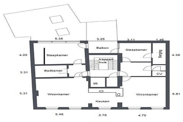 Indeling -Entree (2). -Woonkamer 67m². -Open keuken met fraaie inbouwcombinatie inclusief inbouwapparatuur: Bora inductiekookplaat met afzuigsysteem, koelkast, diepvriezer en vaatwasmachine. -Toilet met fonteintje. -CV ruimte. -Slaapkamer 1 (4,22 x 3,84m) met inloopkast. -Slaapkamer 2 (3,71 x 2,87m). -Badkamer (3,31 x 2,16m) met ligbad, wastafel en toilet. -Berging (4,38 x 1,46m). *Gehele appartement voorzien van fraaie houten vloer.