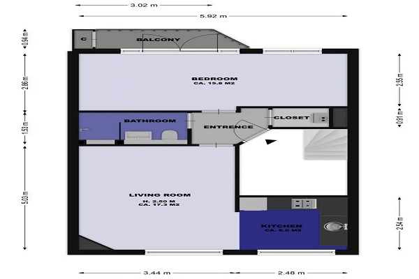Indeling: Bij binnenkomst tref je de entree via een gedeelde hal met trappenhuis. De woning bevindt zich op de tweede verdieping. De ruime woonkamer beschikt over een open keuken aan de voorzijde van het appartement. De keuken is van alle gemakken en diverse inbouwapparatuur voorzien (koelkast + vriesvak, inductiekookplaat, oven, en vaatwasser) en beschikt over voldoende opbergruimte. Badkamer met douche, wastafel, spiegel en wc. De grote slaapkamer bevindt zich aan de achterkant van het appartement en geeft toegang tot een balkon. Een woonruimte ter grootte van 48 m² gebruiksoppervlakte gelegen op de tweede verdieping.