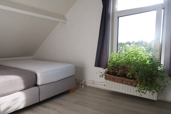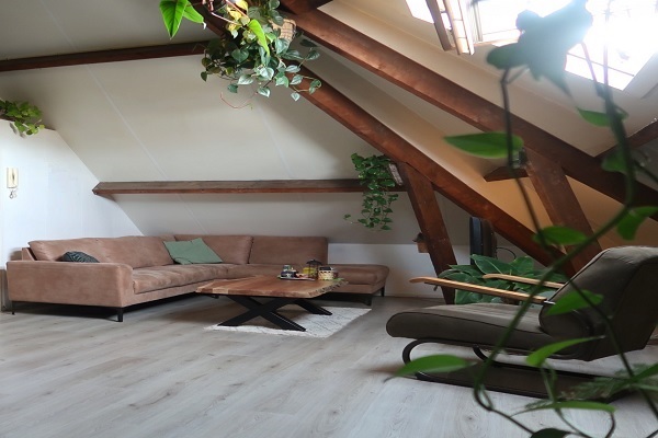 Het appartement is gelegen op de bovenste verdieping. In de woonkamer bevindt zich de open keuken die van alle gemakken is voorzien, waaronder een inbouwkoelkast, een 4-pits kookplaat en een afzuigkap. Verder beschikt het appartement over een slaapkamer en een volledig betegelde badkamer met douche, wastafel en toilet.