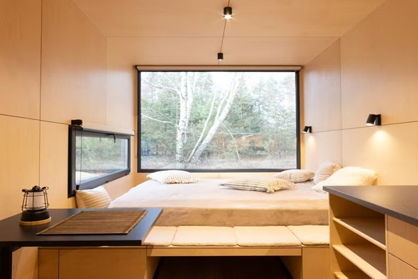 Solo-natuurliefhebbers of digitale nomaden Stellen die op zoek zijn naar een romantisch uitje Schrijvers, creatievelingen of iedereen die een rustig toevluchtsoord nodig heeft Volledig ingericht met alles wat je nodig hebt Woon-/slaapgedeelte met een comfortabel kingsize bed en een groot panoramisch raam Keukentje met kookplaat, koelkast en opbergruimte Eigen badkamer met douche en toilet