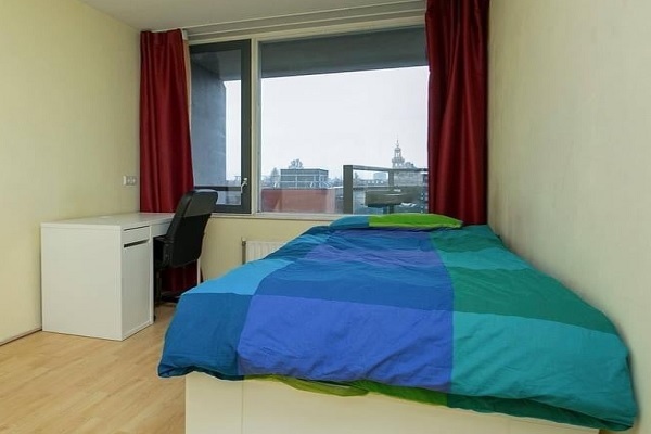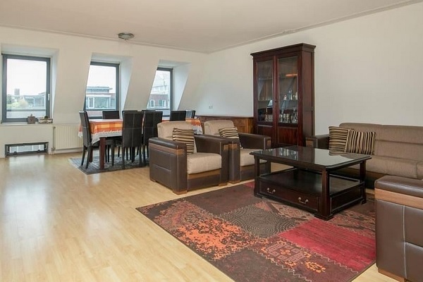 Indeling: Lift/trappenhuis naar de ingang op de 6e verdieping. Via de hal bereikt u de ruime woonkamer met mooie ramen aan de voorzijde. Omdat het appartement op de op één na hoogste verdieping ligt, zorgen de grote ramen voor veel licht, wat het ruimtelijke gevoel van een al grote woonkamer nog versterkt. Nette open keuken met diverse inbouwapparatuur waaronder TWEE koelkast/vriezer, een magnetron, 4-pits elektrische kookplaat en een vaatwasser. Centraal gelegen ruime badkamer met bad, douche en wastafel, separaat toilet met fontein en een grote berging met wasmachine en een kleine kast. Aan de achterzijde bevinden zich twee ruime slaapkamers, de grootste slaapkamer biedt via een deur toegang tot het zonnige balkon dat op het noordwesten ligt. Het gehele appartement is netjes ingericht met klassiek echt houten meubilair. Delen toegestaan voor maximaal twee werkende professionals