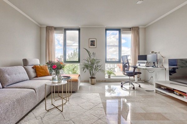 INDELING Ruime en diepe hal met spiegel en de trap naar de 1e verdieping. Aan de achterzijde van het complex is tevens een berging incl. elektra aanwezig, dit voor bijvoorbeeld stalling van de (elektrische) fiets. Op de 1e verdieping bevindt zich de overloop, twee slaapkamers en de badkamer. De eerste slaapkamer is ingericht als hoofdslaapkamer met een 2-persoonsbed en garderobekast. De tweede slaapkamer is ingericht als thuiswerk ruimte met tevens een kledingkast en ladekast. De badkamer is voorzien van een inloopdouche, moderne wastafel met meubel, spiegel met verlichting, extra kast en een zwevend toilet. Via de trap kom je uit in de ruime woonkamer voorzien van grote ramen welke zorgen voor veel licht en uitzicht over de buurt en het water aan de voorzijde van de woning. De woonkamer is modern ingericht, nette wandafwerking en een luxe hardstenen vloer met vloerverwarming. Daarnaast is voldoende ruimte voor het inrichten van een 2e thuis werkplek aan de voorzijde van de living (zie foto's ter indicatie). In de doorloop tussen de woonkamer en de keuken bevindt zich een 2e separaat toilet. De goed onderhouden moderne keuken is voorzien van diverse inbouwapparatuur, o.a. een koelkast, vriezer, vaatwasser en combi-oven/magnetron. Tevens bevindt zich hier een kast met o.a. de wasmachine en extra bergruimte. Via de schuifpui in de keuken is toegang tot het zonnige en ruime balkon waar je vrij zicht hebt. Ideaal en privé buiten genieten het hele jaar!