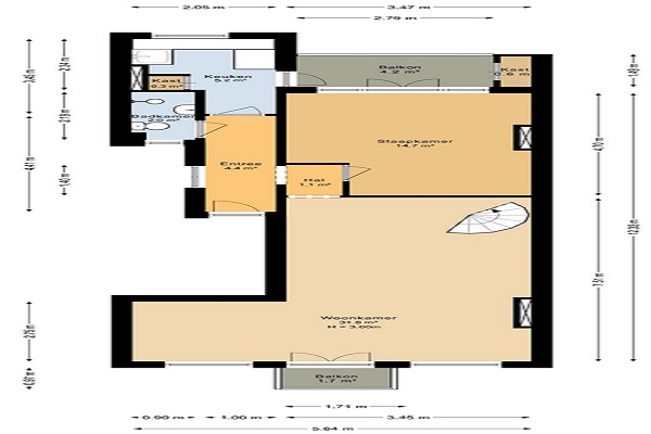 Het appartement bevindt zich op de derde verdieping. Bij binnenkomst is er aan de linkerkant een modern afzonderlijk toilet. Naast het toilet bevindt zich de badkamer, voorzien van een douche en wastafel, met toegang tot een gezellig balkon. Vanuit de gang kom je zowel in de ruime slaapkamer met een groot raam als in de woonkamer, die in een aparte kamer ligt en beschikt over een open, moderne keuken. De keuken is volledig uitgerust met inbouwapparatuur waaronder een combi-oven-magnetron, koelkast, inductiekookplaat, afzuigkap en vaatwasser.