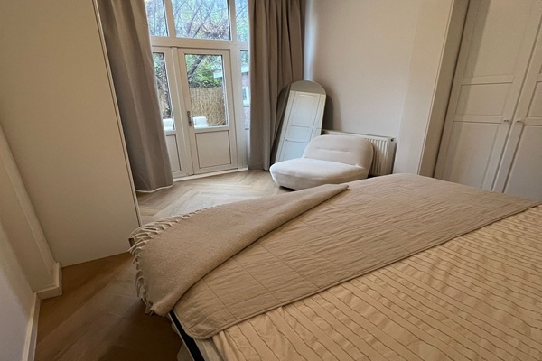 Indeling: Voortuin, gedeelde entree, voordeur appartement. De riante woonkamer ligt aan de voorzijde en heeft openslaande deuren naar de voortuin gelegen op het Zuidoosten en een nieuwe open keuken (in L-opstelling voorzien van 4-pits kookplaat, oven, koel-/vriescombinatie, vaatwasser en afzuigkap.) Deur naar de achtergelegen master bedroom met toegang tot de groene en diepe achtertuin met handige opbergschuur van steen. De tweede goed formaat slaapkamer ligt ook aan de achterzijde en heeft eveneens toegang tot achtergelegen heerlijke tuin. Deze slaapkamer is ook voorzien van kunststof kozijnen met dubbel glas. Vanuit de gang is de keurige badkamer bereikbaar met fraai natuurstenen tegelwerk, heerlijk ligbad, een breed wastafelmeubel, handdoekradiator en modern wandcloset. Een centraal gelegen appartement met groene oase als achtertuin.