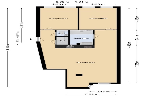 Indeling Bij binnenkomst kom je in de royale woonkamer die zich uitstrekt over de gehele voorzijde van de woning. Met een breedte van bijna 4 meter en een diepte van ruim 7 meter biedt deze ruimte volop mogelijkheden voor een gezellige zithoek en een ruime eethoek. Dankzij de schuine gevel en de grote raampartijen aan de voorzijde geniet je hier van veel lichtinval en een speelse indeling. De keuken is centraal in de woonkamer gesitueerd, direct naast de entree en tegenover de badkamer. Dit maakt het een praktische en functionele plek, waarbij koken en wonen op een prettige manier samenkomen. Het appartement beschikt over twee slaapkamers, beide gelegen aan de achterzijde van de woning: - De linker slaapkamer meet ca. 2,95 m breed en 4,18 m diep. - De rechter slaapkamer is vrijwel even groot met ca. 2,93 m breed en 4,18 m diep. Beide kamers zijn toegankelijk vanuit de woonkamer en bieden rust en privacy. De badkamer is centraal gelegen in de woning, direct bereikbaar vanuit de woonkamer en naast de slaapkamers. Deze ruimte is praktisch ingedeeld met onder andere ruimte voor een wastafel en douche. Naast de badkamer bevindt zich een apart toilet, wat extra comfort biedt. De CV-/technische ruimte grenst aan het toilet en is netjes weggewerkt, maar toch eenvoudig bereikbaar. 2 werkende collega's toegestaan