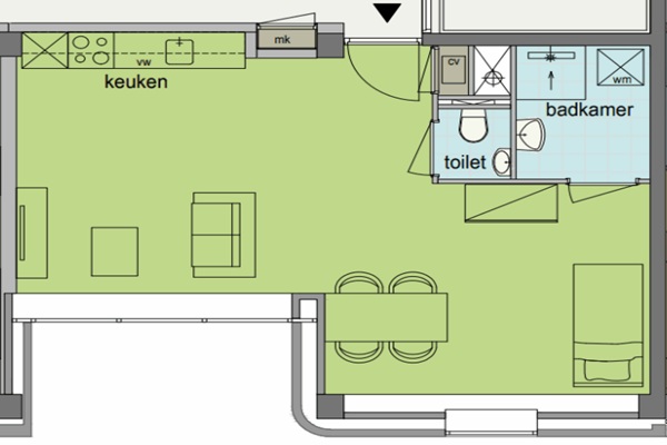 Deze studio is ongeveer 44 m2 groot en is voorzien van woon, slaap en eetruimte. De keuken is voorzien van inbouwapparatuur. De badkamer heeft een inloop douche en wastafelmeubel. De studio is voorzien van een aparte toiletruimte. Ook hoort bij deze studio een parkeerplaats, deze zit inbegrepen bij de huurprijs.