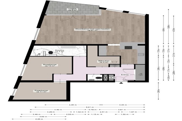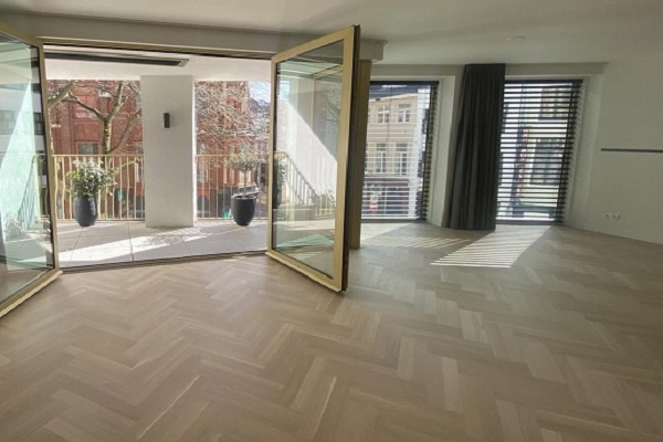Indeling: Entree/hal, garderobe, technische ruimte en meterkast. Moderne keuken met kookeiland en luxe inbouwapparatuur. Ruime lichte woonkamer met toegang tot inpandig terras. Gang met toilet, bijkeuken/wasruimte/opbergruimte. Twee slaapkamers, royale badkamer met 2e toilet. Ruimte berging in kelder. Deze woning wordt verhuurd aan één huishouden