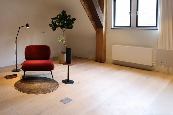 Indeling: Met de lift bereikt u de eerste etage dan gaat het naar de gang, de woning is aan de voorzijde van het gebouw gelegen. entree in de woonkamer (8.00m. x 6.50m) voorzien van een strakke moderne gashaard en Eiken houten vloer met geïntegreerde stopcontacten in de vloer. Hier zijn de originele houten verdiepingsvloeren en spanten bewaard gebleven vandaar de stoere uitstraling. In de woonkamer is de open keuken voorzien van een inductiekookplaat, combioven, koelkast, afzuigkap en vaatwasser (alles ATAG). Vanuit de keuken is er toegang tot de separate zeer ruime berging met de aansluiting voor de wasmachine en droger. Achter de keuken is er een royale houten trap naar het slaapkamervertrek (3.00m.x7.00m) met balkenpartij, vaste bed-ombouw met geïntegreerde verlichting. Vanuit de slaapkamer is er toegang tot de badkamer (2.40m.2.38m) v.v. ruime douche, dubbele wastafel met meubel en toilet. Tevens er toegang tot berging met de technische installatie.