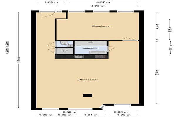 Indeling Bij binnenkomst kom je in de royale woonkamer die zich uitstrekt over de gehele voorzijde van de woning. Met een breedte van bijna 4 meter en een diepte van ruim 7 meter biedt deze ruimte volop mogelijkheden voor een gezellige zithoek en een ruime eethoek. Dankzij de schuine gevel en de grote raampartijen aan de voorzijde geniet je hier van veel lichtinval en een speelse indeling. De keuken is centraal in de woonkamer gesitueerd, direct naast de entree en tegenover de badkamer. Dit maakt het een praktische en functionele plek, waarbij koken en wonen op een prettige manier samenkomen. Het appartement beschikt over een slaapkamer, aan de achterzijde van de woning aan de galerijkant: De badkamer is centraal gelegen in de woning. Deze ruimte is praktisch ingedeeld met onder andere ruimte voor een wastafel en inloopdouche. Naast de badkamer bevindt zich een apart toilet, wat extra comfort biedt. De CV-/technische ruimte beschikt over een wasmachine.