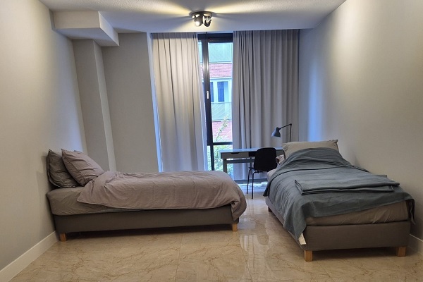 Indeling Gedeelde entree op de begane grond met lift naar de eerste verdieping. Entree van het appartement in de hal met toilet en deuren naar alle kamers. Ruime woonkamer, volledig modern ingericht. Open keuken met vaatwasser, oven/magnetron, 4-pits gasfornuis en vriezer/koelkast. Berging met planken. Ruime hoofdslaapkamer met tweepersoonsbed en kast. De 2e slaapkamer is bijna even groot en heeft eveneens een tweepersoonsbed en kast. Badkamer met inloopdouche, wastafel, handdoekradiator en wasmachine/droger. Het gehele appartement is voorzien van vloerverwarming. Dubbel glas. Woning delen mogelijk tussen twee jonge professionals