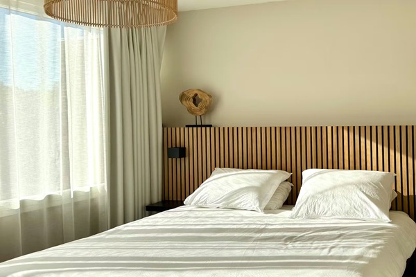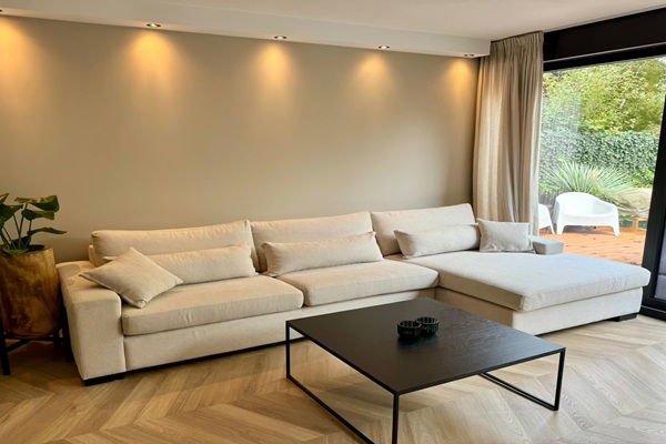 Stap binnen in deze lichte, moderne woning met een volledig ingerichte keuken (stoomoven, kokendwaterkraan, inductiekookplaat, vaatwasser) en bijkeuken met extra koelkast/vriezer, wringmachine en droger. De woonkamer heeft een grote led-tv, een comfortabele bank en grote schuifdeuren naar een ruime privé-achtertuin. Boven vind je een grote slaapkamer met tv en airconditioning, een moderne badkamer met inloopdouche en dubbele wastafel, een kleedkamer en een kantoor met uitzicht op de tuin met een bureau, stoel, monitor en opbergruimte.