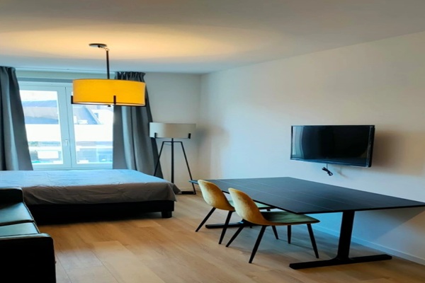 Indeling: Gedeelde entree met brievenbussen, bellentableau, lift en toegang tot de gezamenlijke tuin. De studio is uitgerust met hip meubilair, oa. een tweepersoonsbed, linnenkast, tafel, stoelen, TV. De open keuken is voorzien met een kooplaat, afzuigkap, koelkast en magnetron. De volledig betegelde badkamer is voorzien van een douche en wastafel met spiegel. De studio is geschikt voor 1 persoon