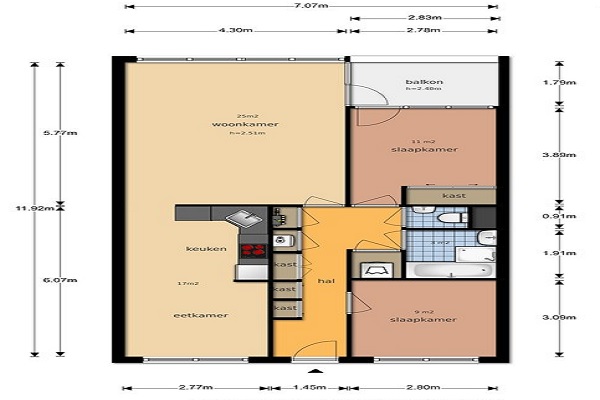 De indeling is als volgt: Je komt binnen in de centrale entree/hal met intercom, trappenhuis en liften. entree/hal met toegang tot 2 slaapkamers (11m2 en 9m2; grootste kamer met ruime ingebouwde kledingkast). Verder is in de hal toegang tot extra kledingkasten, opbergkast, meterkasten, ruimte voor wasmachine en wasdroger, toilet met fontein en badkamer met ligbad, aparte douche en wastafel. De ruime (25m2) en zeer lichte woonkamer biedt een vrij uitzicht en geeft toegang tot het balkon op het zuiden. Aangrenzend aan de woonkamer is de eetkamer (17m2) en open keuken met (inbouw)apparatuur te weten: keramische kookplaat, magnetron, afzuigkap, koelkast, vriezer, vaatwasser. Het gehele appartement is voorzien van een lichte lamelparket vloer. Toegang tot eigen parkeerplek in garage. Geen woningdelers;