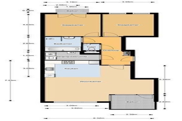 Indeling: Begane grond: gemeenschappelijke entree, toegang tot de parkeergarage, berging, fietsenstalling, lift: Tweede verdieping: ingang appartement, hal. Woonkamer (7.5 x 6.3) met houten vloer, eetkamer en toegang tot een van de balkons (2.39 x 2.62), open keuken met 5-pits gasfornuis, twee ovens (combi-oven/magnetron en standaard oven), koelkast. Twee slaapkamers (4.03 x 3.19 en 4.03 x 3.05) waarvan een met toegang tot het tweede balkon. Ruime luxe badkamer (2.65 x 2.08) met inloopdouche en bad. Separaat toilet. Was- en opbergkamer.