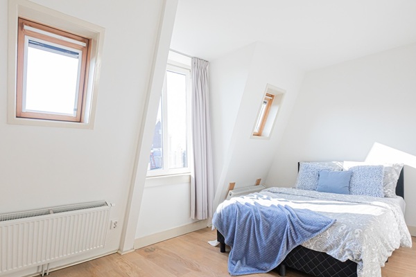 INDELING Het appartement is bereikbaar via het gedeelde trappenhuis en is gelegen op de vierde verdieping. Aan de achterzijde van de woning vindt u de woonkeuken met een open indeling, voorzien van een vaatwasser, koelkast met vriesvak, inductiekookplaat en een combi oven/magnetron. Naast de woonkeuken bevindt zich de eerste slaapkamer, ingericht met een tweepersoonsbed en kledingkast. Aan de voorzijde van het appartement bevindt zich de tweede, grotere slaapkamer, eveneens ingericht met een tweepersoonsbed en kledingkast. De badkamer beschikt over een ligbad, inloopdouche, dubbele wastafel, douche en toilet. De interne trap biedt toegang tot het heerlijke dakterras. Een comfortabel appartement op een uitstekende locatie!