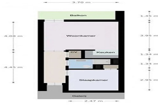 INDELING Gezamenlijke fietsenberging voor de appartementen. Algemene ingang met bellentableau en brievenbussen. In de centrale hal bevinden zich de 2 liften van het pand. Via een galerij bereikt u vervolgens het appartement. Appartement bestaat uit entree/hal (1,12 x 4,44). De hal geeft toegang tot een slaapkamer (2,45 x 3,18) met ruime 3-deurs garderobekast. Een badkamer (1,31 x (1,26 en 2,12) met douche, toilet en wastafel. Bergkast (1,17 x 0,72) met wasmachine. Woonkamer (4,15 x 3,70) met open gerenoveerd keukenblokje (1,30 x 1,66) die toegang geeft tot een ruim balkon (3,70 x 1,23) over de gehele breedte.